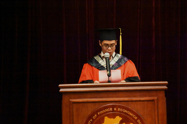 之后教师代表钱璐老师、毕业生代表金燕楠同学、在校生代表张琴同学相继上台发言,表达了对全体毕业生诚挚的祝福,希望每一位同学能够在未来享受更加精彩的人生。钱璐老师谈到,衷心地希望每一位毕业生无论是走向工作第一线,还是选择继续深造,都能坚持不断地向书本和实践学习,进一步充实和丰富自己,让学习成为你的一种生活习惯。毕业生代表金燕楠同学则回顾了在浙财走过的四年青春。在向母校深情告白之时,她也说出了所有毕业生的心里话:愿学生时代里踏实、纯粹的“少年感’永不褪色;愿“进德修业,与时偕行”的校训与我们一路相随;愿梦想常青,担当常在,你我无愧于这个时代。
