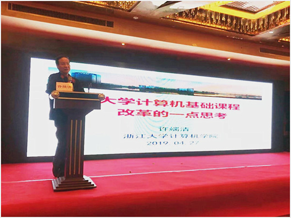 会上浙江大学计算机基础教学中心主任许端清教授讲了大学计算机基础课程教改理念与思路,浙江工业大学的龙胜春老师、浙江师范大学的马永进老师、浙江农林大学暨阳学院的李英杰等各兄弟院校的计算机公共教学负责人分享相关教学实践经验。浙江大学的陈春晖教授2005年就开设了python课,他介绍了Python程序设计课程体系与教学经验分享,带给了我们耳目一新的感觉,让我们深知Python的教学的方法不同于以前的C和VFP的教学,要侧重于Python语言本身的无穷魅力和丰富的第三方库。浙江大学最受学生欢迎的陈越“姥姥”的“面向程序设计能力培养的在线生态建设”,中文MOOC第一人的翁恺的“Python程序设计的翻转课堂与慕课教学方案”以及季江民的“面向Python的程序设计语言课程教学供给侧改革”,干货满满,内容精彩纷呈。最后教育部高等学校大学计算机课程教学指导委员会副主任何钦铭做总结发言,他梳理了二十多年来大学计算机基础课程体系的演变历程,结合“新工科”建设,介绍了当前全国和全省关于大学计算机基础课程教学改革的方向及思路,并提出教学改革的重要目标是培养学生的计算思维和融合创新能力。