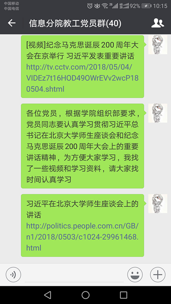 根据学院组织宣传部部署要求,信息分院党总支积极准备《图解:习近平在纪念马克思诞辰200周年大会上讲话的16个金句》、《纪念马克思诞辰200周年大会》视频、《习近平在纪念马克思诞辰200周年大会上的讲话》等学习材料要求各支部开展学习。5月16-20日,各支部通过观看视频、召开学生骨干、入党积极分子、党员座谈会、集中学习等方式,学习贯彻习近平总书记在北京大学师生座谈会及纪念马克思诞辰200周年大会上重要讲话精神。
