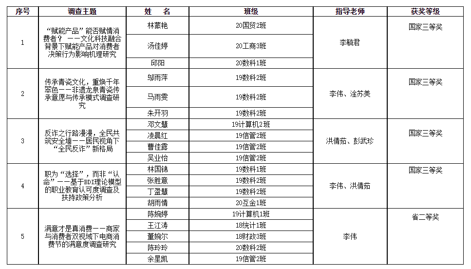 数据科学、应用统计、计算机、财政、信息管理学生陈婉婷、董婉尔、王江涛、余星凯、陈玲玲完成的调查报告《满意才是真消费——商家与消费者双视域下电商消费节的满意度调查研究》获得省二等奖。