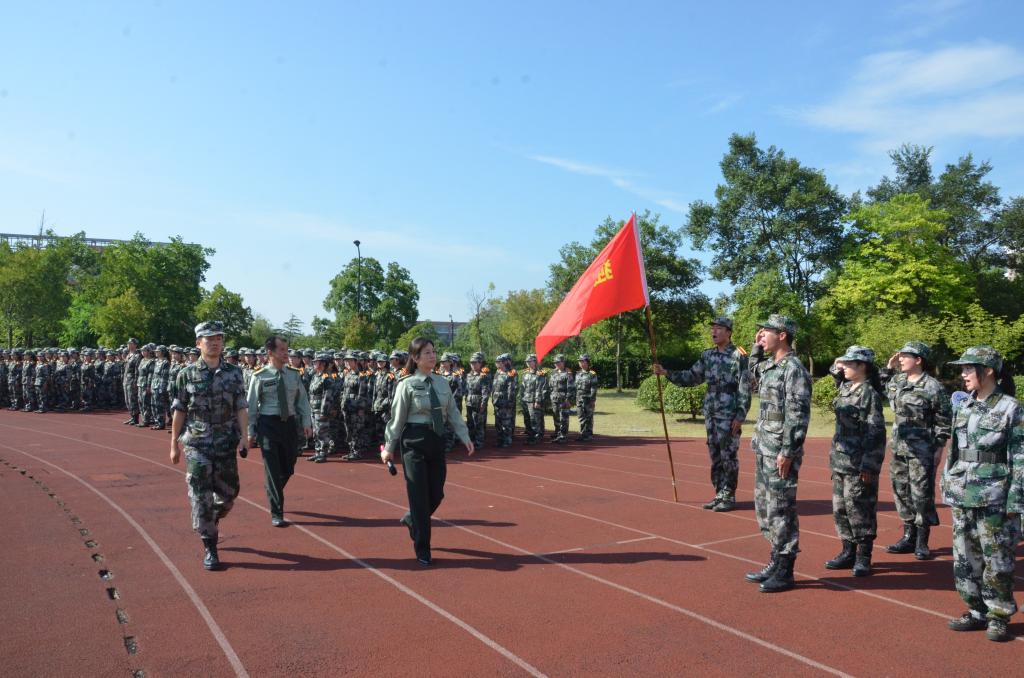 晴空万里的早晨,在激昂的国歌声中进行了庄严的升旗仪式,随后,我院党委书记申屠莉对军训队伍进行了检阅,在一声声铿锵有力的“首长好”,“为学院争光”的口号中拉开了分列式表演的序幕。