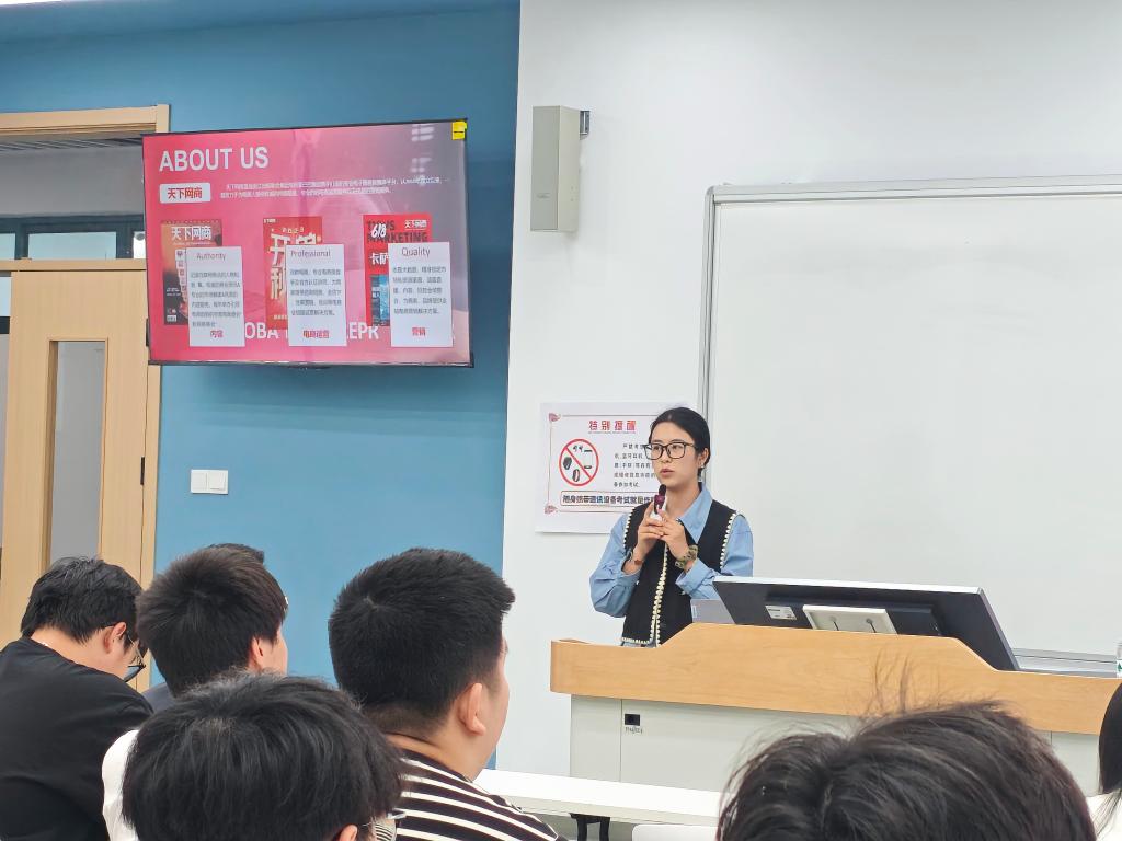 宣讲会上,企业资深HR梁莎楠对电商行业前景进行了深入剖析,并详细介绍了企业的发展历程、业务范围。针对本次招聘,从实习岗位设置、岗位职责、任职要求,到实习期间的培养计划、薪酬福利、晋升通道,都一一进行了详细说明。并以我院 24 届电商专业的优秀校友王子安为例,分享其从实习小白成长为项目负责人的蜕变历程。最后通过视频短片、员工故事分享等形式,生动展示企业的核心价值观。