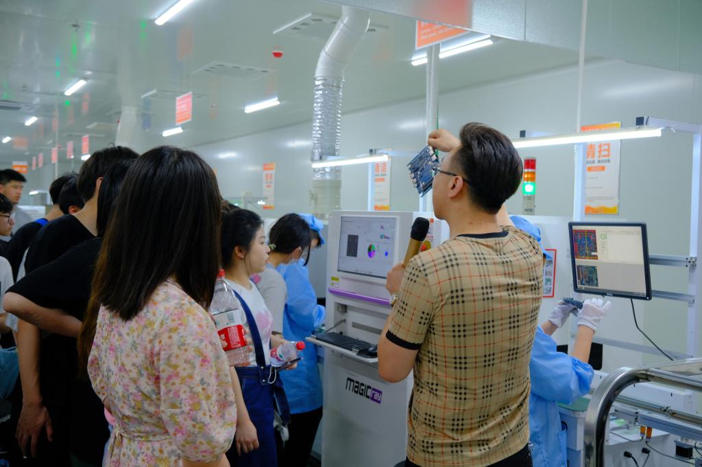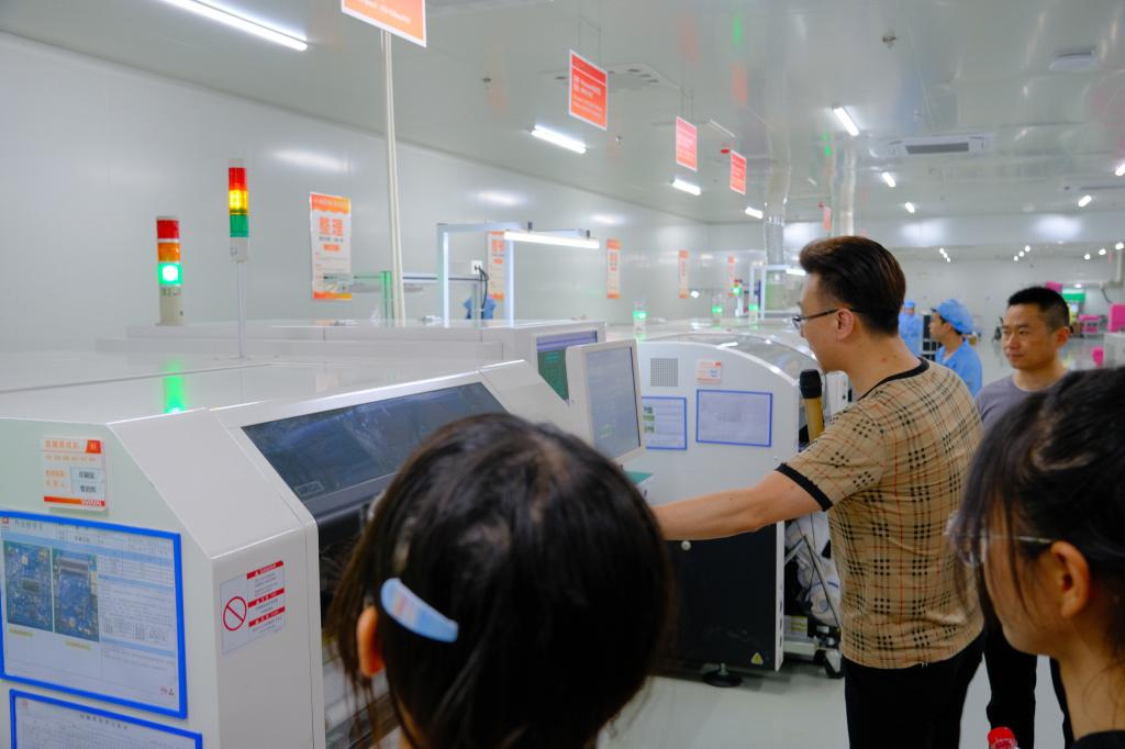 路演宣讲完毕后,同学们分成了4个小组,在工作人员的带领下开始进行园区及企业参观。同学们分别参观了万物工场的园区、华绰信息科技有限公司的电子设备厂、小安优行的联合实验室以及园区的峰会中心。同学们表现出极大的兴趣,通过参观也切实了解到了万物工场内企业的具体情况及环境氛围。有的同学还在现场询问了关于是否可以参与暑期实习的问题,负责人表示非常欢迎,愿意为我校学生提供岗位,优势互补。
