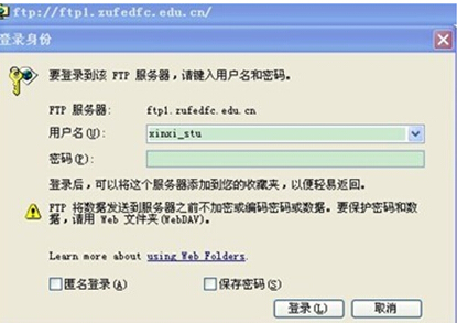 1、采用FTP上传:服务器地址:ftp://ftp.zufedfc.edu.cn(校内),用户名:xinxi_stu 密码:xinxi_stu。FTP服务器上相关目录已经建立,请各位同学严格按照文档目录结构上传。
