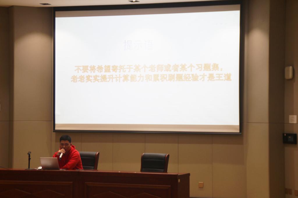 接下来由成功被浙江工业大学计算机技术专业录取的王锦涛同学介绍了他的考研复习经验。首先王锦涛介绍了浙江省计算机专业考研高校排名情况,建议学生在选择考研院校时应结合自身实际情况,量力而行。接下来王锦涛介绍了考研数学中高等数学、线性代数、概率论与数理统计的参考书目和材料,在复习的过程中王锦涛建议要加强计算能力同时对专项题目进行强化,针对初中学过的知识和一些常用公式要牢牢掌握,同时推荐了一些网上有用的辅助教学视频和公众号,在最后两个月的冲刺阶段,王锦涛建议刷近几年的真题和市面上模拟冲刺题,要加强计算能力和题目熟练度,在这过程中要注意不能过分追求技巧和难题而舍本逐末。建议准备考研的学生在大二或大三时多参加院级和省级数学竞赛及全国大学生数学竞赛,为考研数学打下基础。他强调不能寄希望于某个老师或者某本习题集,踏实提升计算能力和积累刷题经验才是王道。专业课方面,王锦涛指出对于自命题的专业课一定要找到目标院校的学长学姐,在大一大二的时候可以刷刷PAT(计算机程序设计能力考试)方面的试题,大三时多做课后算法练习题。总之,考研各门专业课的复习都要做一个详细的时间规划,严格按照规划来施行。
