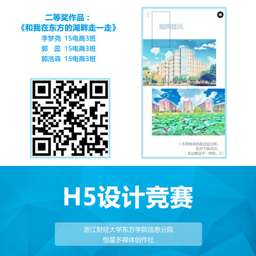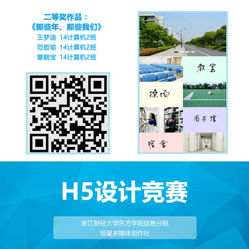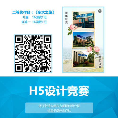 为丰富和活跃校园文化氛围,信息分院举行我院首届H5设计竞赛,围绕“我眼中的东方”和“我与我的专业”两个主题更好的宣传和展示学院风采及各专业特色。H5是集文字、图片、音乐、视频、链接等多种形式的展示页面,具有精美的展现形式、灵活的动画效果和强大的交互能力。随着互联网的飞速发展,H5作为一种易操作、易传播的形式风靡网络,在微信等社交平台大放异彩。下面给大家欣赏本届H5设计竞赛一等奖和二等奖作品,可以使用手机扫二维码在移动端观看,也可点击链接在网页版观看。希望在成果展示的同时给大家开阔思路,来年有更多东方学子能够参与到H5设计竞赛中,一展风采。