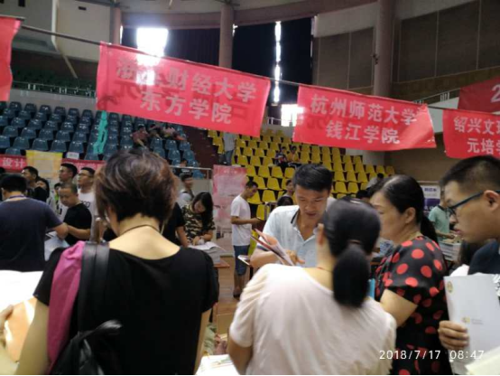 2018年7月17日我院由信息分院淦苏美和王硕两位老师组成的招生宣传工作组赴嘉兴开展招生宣传工作。本次招生宣传会安排在嘉兴学院体育馆内,参会学校众多,不仅有来自省内的大学,还有多所来自河北、山东和黑龙江等外省高校,招生咨询现场十分火爆。